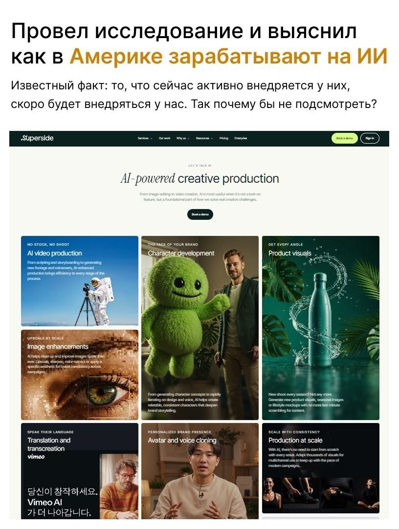 👉 Суть. Начал работать над сайтом Нейро-фотостудии и в голову полезли сомнения. А это вообще перспективно?Стоит на это тратить время? Вон, уже даже на Авито полно объявлений. Чтобы сомнения убрать (или подтвердить) я обычно делаю небольшое исследование рынка США. Если там какая либо тема в тренде и развивается, то значит и к нам скоро придет. 📌 Краткий итог - Спрос на услуги дизайн-студий, использующих нейросети для коммерческой графики, высок в США - Особенно высокий спрос в e-commerce, где бренды экономят на традиционных фотосессиях (до 70%) и ускоряют создание контента - Это видно по росту агентств вроде Superside и Noomo, обслуживающих тысячи клиентов - Предложение формулируется как "AI + человеческий креатив: масштабируемый дизайн без потерь качества" - Перспективы позитивные – рынок растет на 35% ежегодно, с трендами на AI-видео, AR и data-driven дизайн ✅ Вывод Как я и предполагал, основной способ заработка на ИИ - это замена традиционных фотостудий. Поэтому, Нейро Фото