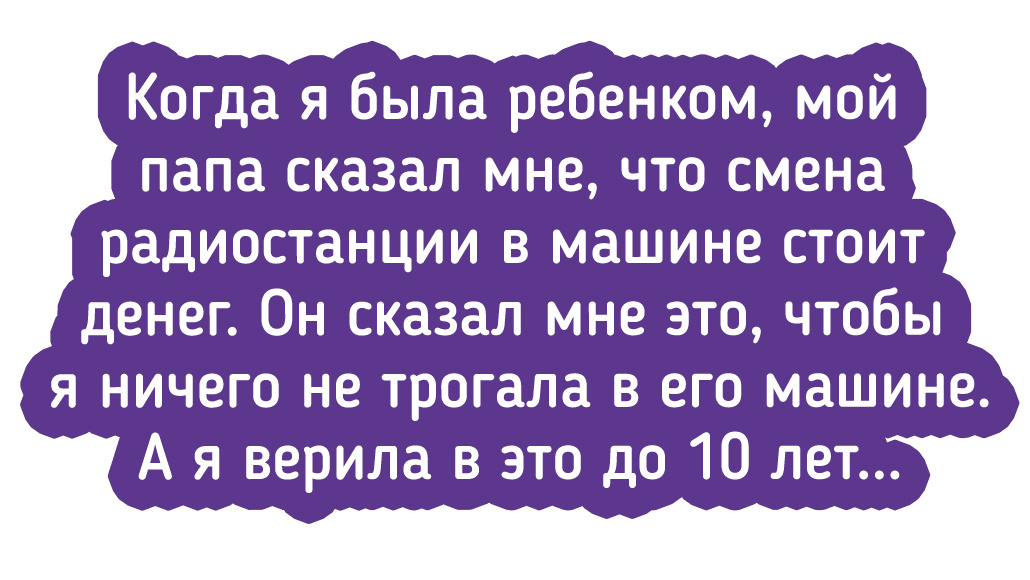 Каждый ребенок — чистый лист, который готов впитывать любую информацию, даже откровенно бредовую. И вырастая, многие из детишек понимают, какой глупости они когда-то нахватались. Именно такие свои наивные заблуждения и решили раскрыть герои этой подборки. 1. Потерял мягкую игрушку (белую собаку) в аэропорту, когда мне было 5. Она была моей любимой, и я очень грустил. Спустя время мама подарила мне коричневую собаку, которая выглядела точно так же, как белая. Она сказала, что работники аэропорта нашли ее и отправили нам по почте. А загорела она, потому что была у моря. Несколько лет эта легенда продержалась. А игрушка теперь принадлежит моему сыну. 2. Я верил, что по всему нашему дому были установлены камеры слежения размером с пробку и что мои родители могли наблюдать за каждым моим шагом. 3. Я всерьез думала, что месячные останавливаются в воде, чтобы акулы не учуяли женщину. 4. Однажды мой старший брат разыграл меня. Я смотрел детское шоу по телевизору, в котором была звезда, танцую