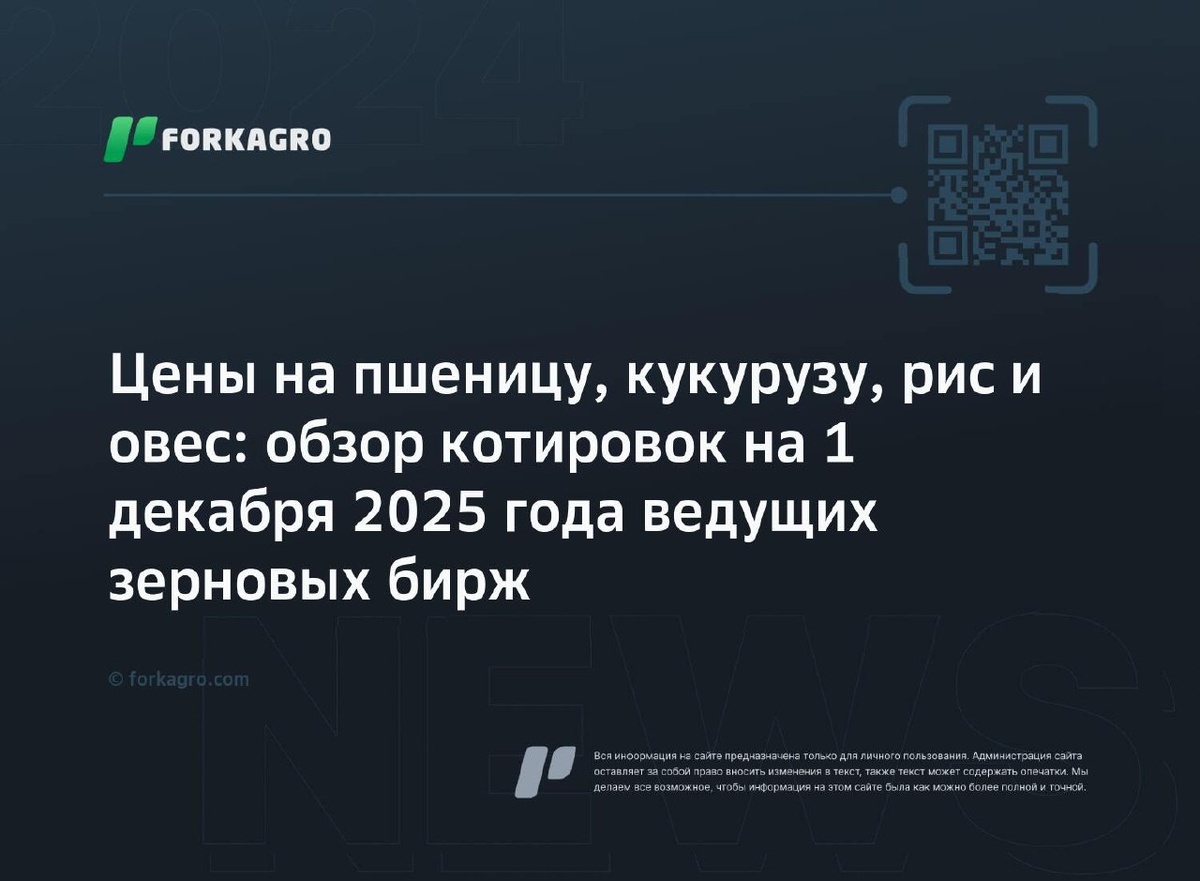 Цены на пшеницу, кукурузу, рис и овес: обзор котировок на 1 декабря 2025 года ведущих зерновых бирж