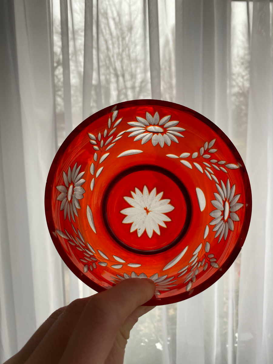 Коллекционирование винтажного фарфора – это, друзья мои, не просто покупка предметов. Это поиск, это открытие, это радость от находки. Каждая новая вещь в коллекции – это маленькая победа, повод для гордости и источник вдохновения. У меня есть не только моя личная коллекция фарфора. С тех пор, как был создан телеграмм-канал, я собираю в памяти тот винтаж, который выбирают мои читатели. И коплю их чудесные эмоции от покупок❤️А это, знаете ли, дорогого стоит. Сегодня на повестке дня традиционный обзор винтажной посуды из моей тележки. Но начну не с фарфора. Было немножко цветного стекла. Его еще называют рубиновым. Триста лет назад процес изготовления был сложен и дорог за счет использования золота в составе. Все упростил один хороший человек, химик, доказавший, что можно такой цвет и без золота получить, заменив его на медь и олово. Вазы, скажем так, свободного назначения. Растительный рисунок нанесен алмазной гранью. Конечно, красный - один из традиционных новогодних цветов. Он хор