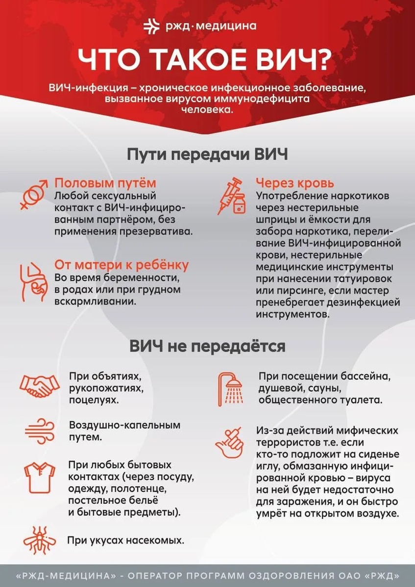 🌍 Сегодня, 1 декабря, отмечается Всемирный день борьбы со СПИДом 🌍 СПИД (синдром приобретенного иммунодефицита) - тяжелое заболевание, которое развивается на фоне ВИЧ-инфекции и ежегодно уносит тысячи жизней. 📊 По данным статистики, ситуация в России остается тревожной: число случаев заражения ВИЧ продолжает увеличиваться, и практически каждый сотый житель нашей страны инфицирован. Многие из них ведут обычный образ жизни и не принадлежат к «уязвимым» группам населения. Риск заражения существует для каждого вне зависимости от социального положения или поведения. ✨ Поэтому, мы обращаемся ко всем с призывом быть информированными о ВИЧ/СПИД, проявлять солидарность и поддержку людям, живущим с этим вирусом, и помнить о важности профилактических мер. #зож_ржд #стопвичспид