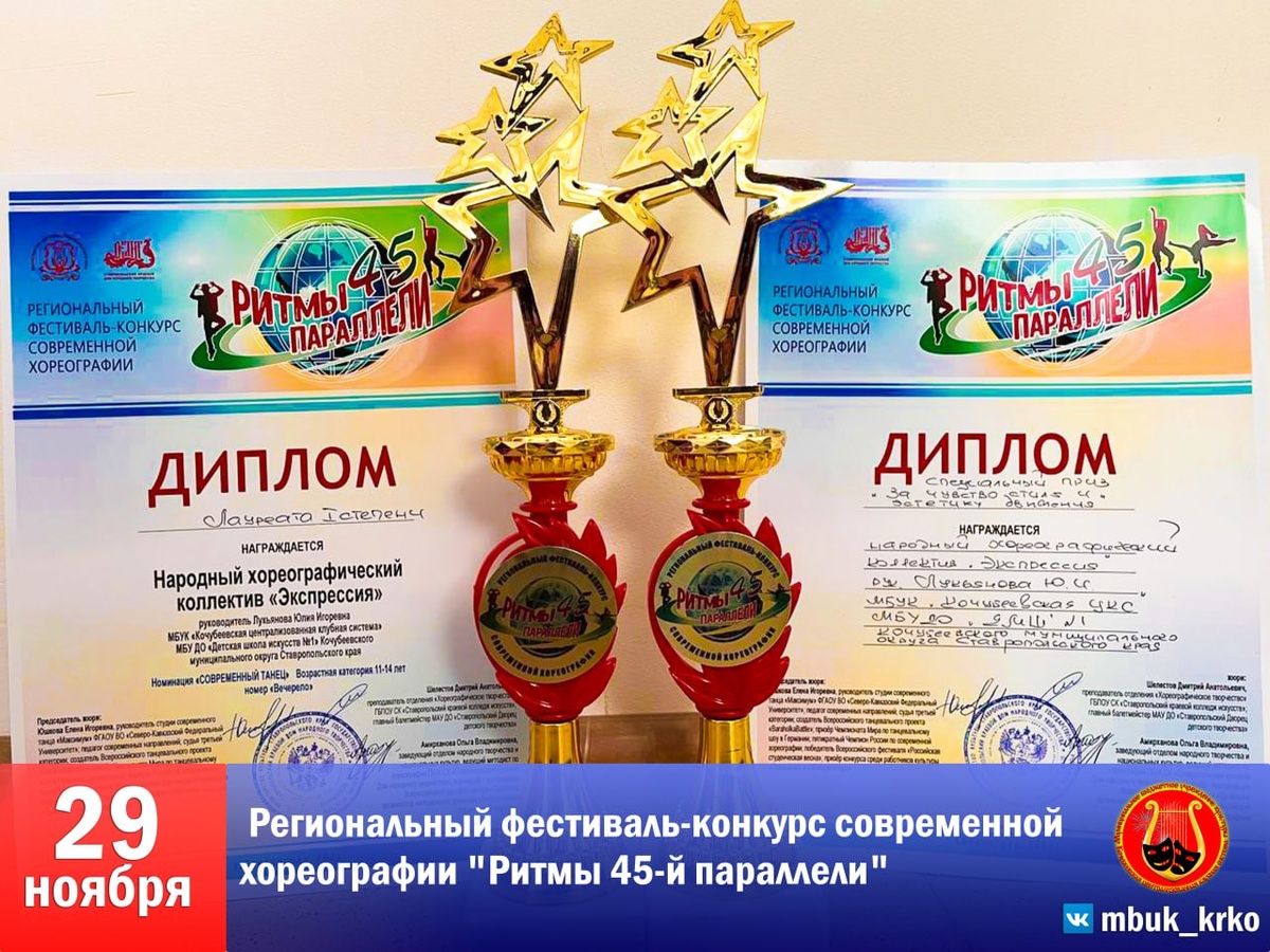 📣☄️ ЭКСПРЕССИЯ ПОКОРИЛА РИТМЫ 45-Й ПАРАЛЛЕЛИ ☄️📣 🗓 В г. Светлограде состоялся яркий и масштабный региональный фестиваль-конкурс современной хореографии "Ритмы 45-й параллели", организованный Ставропольским краевым Домом народного творчества! 🌎 В конкурсе приняли участие около 2000 тысяч артистов, более 45 хореографических коллективов из 15 территорий региона! Благодаря участникам на сцене состоялся 8-часовой танцевальный марафон, а конкурсная программа составила более 80 разножанровых, разнохарактерных постановок! ⭐️ И вновь народный хореографический ансамбль «ЭКСПРЕССИЯ» одержал яркую победу! Ансамбль представил на суд жюри новую трогательную постановку «Вечерело». 🏆⚡️ По итогу в копилке НХА «Экспрессия» диплом лауреата I степени и невероятно почетный специальный приз «ЗА ЧУВСТВО СТИЛЯ И ЭСТЕТИКУ ДВИЖЕНИЯ». ❤️✨ Искренне гордимся и, конечно, поздравляем коллектив и руководителя Юлию Лукьянову! Впереди нас ждут творческие успехи и новые победы, вписанные в историю достижений К