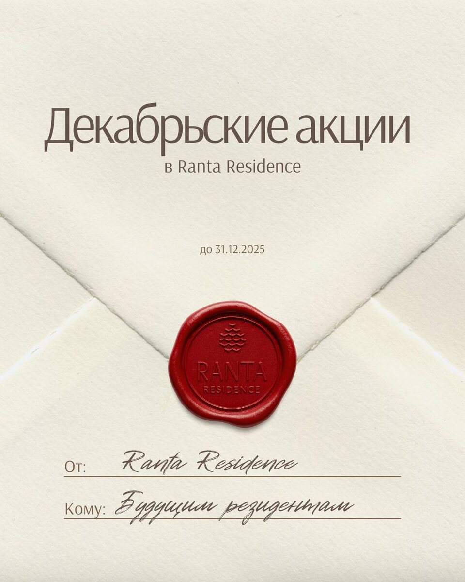 Преддверие Нового года — идеальная пора, чтобы зайти в проект с максимальной выгодой! Что для вас приготовили: - Бессменный хит — скидка 25% При 100% оплате вы получаете скидку 25% от стоимости любой квартиры. - Рассрочка с минимальным первоначальным взносом. Например, 10/10/80 + скидка 25%! Минимальный взнос 10% сейчас, ещё 10% к январю 2026 и потом — оформление ипотеки или полное погашение. - Квартиры месяца по спеццене. Неважно, какую форму оплаты вы выберете: цена фиксирована и уже содержит всё — При покупке квартиры семейного форматова дополнительная скидка 5% суммируется почти со всеми акциями, кроме "Квартир декабря". - Паркинг по фиксированной цене. К каждой семейной или двухуровневой квартире — машино-место на 3 или 4 этаже всего за 2 млн руб. Можно совместить с другими акциями. - Чистовая отделка в подарок. Дарим чистовую отделку RANTA LIGHT и RANTA NIGHT при покупке однокомнатных квартир. - Ставка 0,11% на 12 месяцев При пв от 30% — ставка всего 0,11% первые 12 мес
