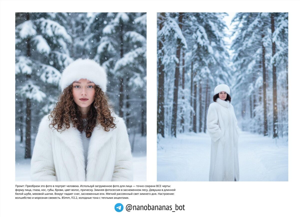 Преобрази это фото в портрет человека. Используй загруженное фото для лица — точно сохрани ВСЕ черты: форму лица, глаза, нос, губы, брови, цвет волос, прическу. Зимняя фотосессия в заснеженном лесу. Девушка в длинной белой шубе, меховой шапке. Вокруг падает снег, заснеженные ели. Мягкий рассеянный свет зимнего дня. Настроение: волшебство и морозная свежесть. 85mm, f/2.2, холодные тона с теплыми акцентами.