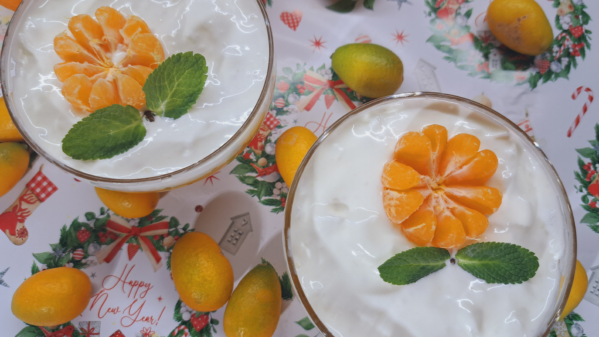 Нам понадобится: 1. Апельсины - 3шт. 2. Сахар - 60г 3. Желатин -10г 4. Взбитые сливки, мандаринки и мята для украшения