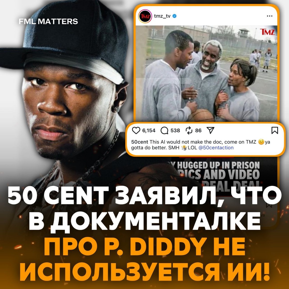 В ответ на пост 💯 «ТАМ НЕТ ИИ!», — 50 CENT О ДОКУМЕНТАЛКЕ ПРО P. DIDDY! Продюсер заявил, что в его сериале «Шон Комбс: Расплата» для Netflix не использовался искусственный интеллект. Это ответ на фейковые ИИ-изображения Дидди в тюрьме Форт-Дикс, которые вирусятся в СМИ. Команда Дидди назвала сериал «позорным хайпом» и обвиняет Фифти в личной вендетте. 💀 FML MATTERS
