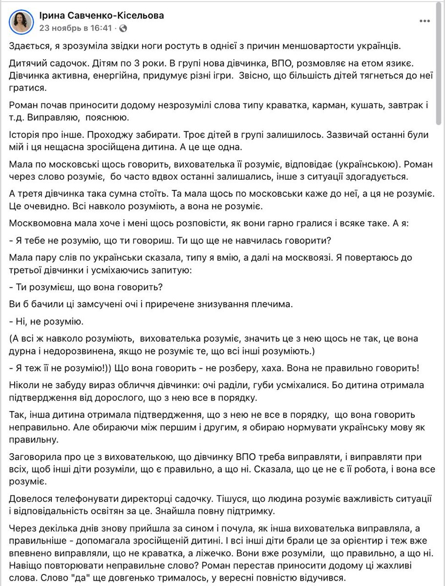 Учитель из Белой Церкви «наехала» на трехлетнюю девочку-переселенку за русский язык. Ее поддержала мовный омбудсмен Ивановская. Ирина Савченко-Киселева, преподающая английский язык, пожаловалась в Facebook, что в детсаду, куда ходит ее сын, появилась девочка-переселенка, которая говорит на русском языке. Она сообщила, что пришла в садик и при других детях и воспитательнице заявила девочке: "Я тебя не понимаю, что ты говоришь. Ты что, еще не научилась говорить?" После этого девочка ненадолго перешла на украинский, но затем продолжила говорить на русском. Тогда Киселева обратилась к другим детям: "Я тоже ее не понимаю! Что она говорит - не разберу, хаха. Она неправильно говорит!" Воспитательнице она заявила, что девочку "нужно исправлять". Та ответила, что это не ее работа. Тогда Киселева пожаловалась директору, и уже через несколько дней, по ее словам, другая воспитательница "исправляла, а точнее - помогала русифицированному ребенку". После этого поста многие раскритиковали автора з