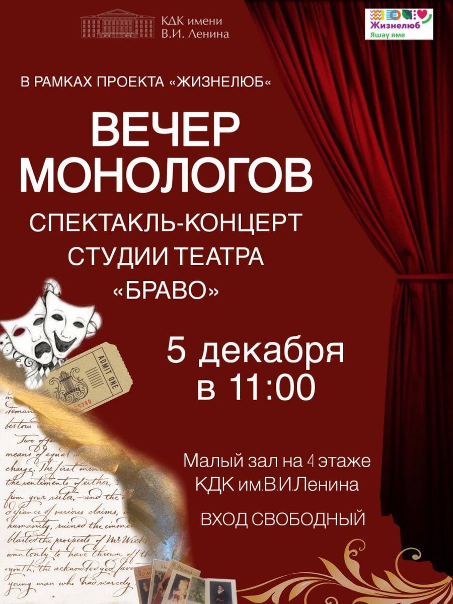 Спектакль-концерт «Вечер монологов» 🗓️ 5 декабря ⏰ 11:00 💸 бесплатно 🏫 КДК им.В.И.Ленина 📍 ул.Копылова, д.2, 4 этаж, малый зал Тёплая, искренняя и проникновенная встреча с искусством слова Участницы студии театра представят монологи российских и зарубежных драматургов — трогательные, мудрые, полные жизненного опыта и эмоций. ➡️ ПОДРОБНОСТИ ⬅️ ❗️ Детская Афиша | Казань Больше информации в нашей группе, переходите