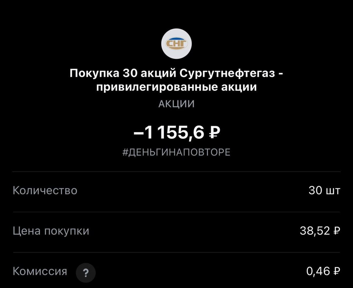 Коллеги, всем привет! Покупка на сегодня в стратегию #деньгинаповторе с цветом денег оставшихся с прошлых сделок. Статистика портфеля на стороннем сервисе, можно посмотреть по "ссылке" 🔗 Все сделки и пополнения ссылка 🟢 ПОКУПКА Эмитент: "Сургутнефтегаз-преф" Тикер: #SNGSP Цена покупки: 38.52 rub 3 лота 🔗 чат для общения "тут" ✈️ Стас Мироненко 📹Youtube | 📹Rutube