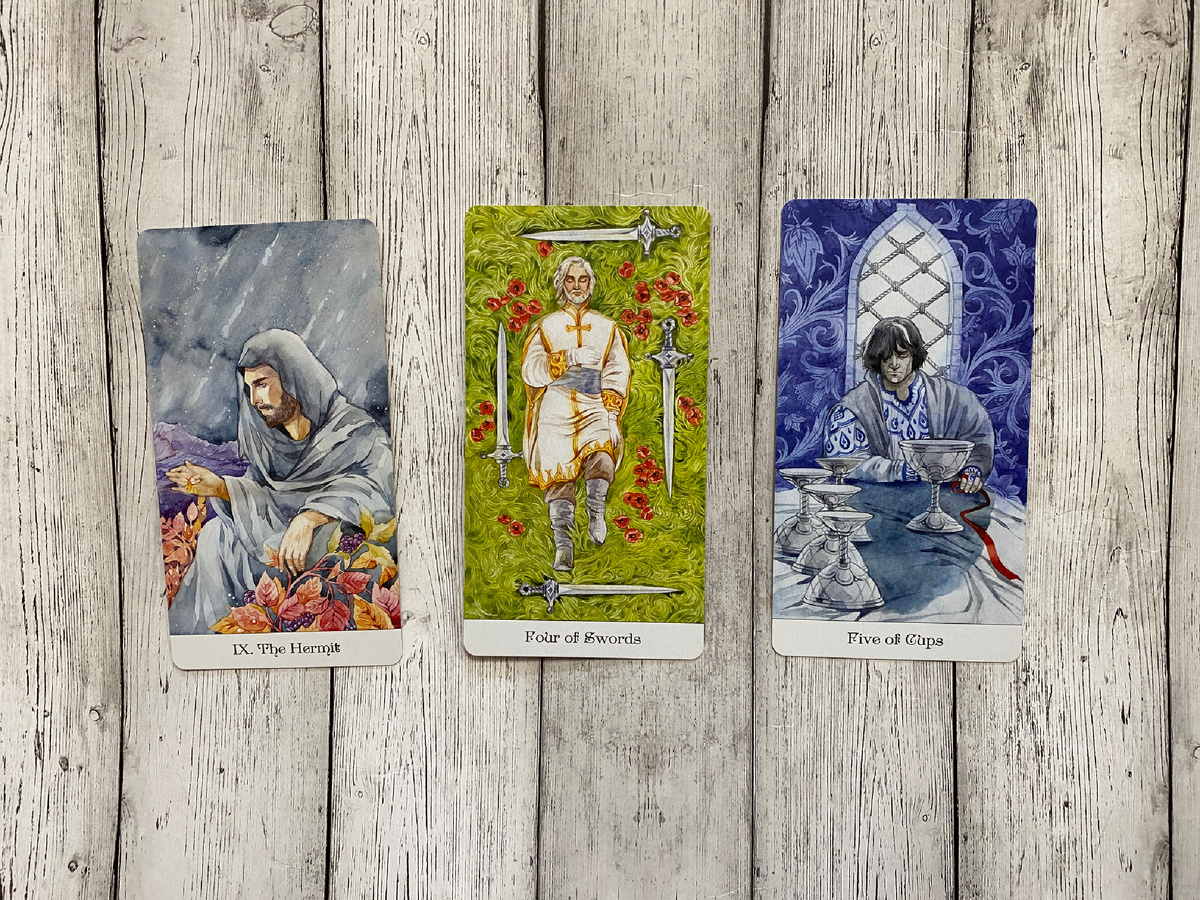 Вторая карта продолжает тему изоляции, но добавляет нюанс тотального истощения. Четверка Мечей показывает, что прямо сейчас он находится в состоянии ментального анабиоза, он буквально "лежит пластом" в эмоциональном смысле. Последние события между вами вытянули из него все соки, и у него физически нет сил на выяснение отношений или активные действия. Он взял паузу, тайм-аут, объявил перемирие с самим собой и с миром. В его голове сейчас звенит тишина, и он делает всё возможное, чтобы не думать о проблемах, блокируя любые раздражители. Он может много спать, уходить с головой в видеоигры, сериалы или монотонную работу - делать всё, что позволяет отключить чувства.