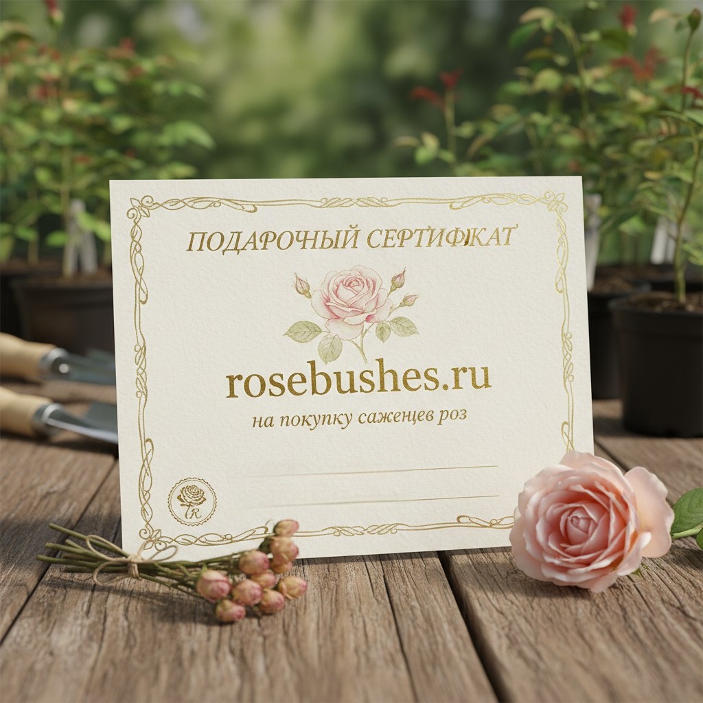 Подарочный сертификат на саженцы роз из каталога rosebushes.ru Идеальный подарок на Новый год, который растет и становится прекраснее с каждым годом. О сертификате Одежду, гаджеты, сладости — а мы предлагаем подарок, который превращается в живое чудо. Подарочный сертификат на саженцы роз с нашего сайта rosebushes.ru — это возможность выбрать свою идеальную розу из сотен сортов в нашем каталоге. Мы хотим, чтобы вы дарили не просто вещь, а мечту и будущую красоту. Поэтому наш сертификат действует 2 сезона (1 год). Получатель сможет тщательно изучить каталог, выбрать лучшее время для посадки (весну или осень) и заказать тот сорт, который покорит его сердце. Как это работает? Сертификат придет на вашу электронную почту или чат в Вотсапе/Максе в виде красивой открытки, оформленной в праздничном или садовом стиле. Его можно мгновенно переслать, даже если вы находитесь далеко, или распечатать и вручить в красивой открытке. Гибкость и удобство · Не нужно тратить всю сумму сразу.