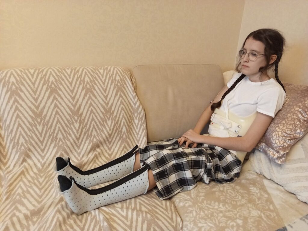 Последние 8 лет Катя постоянно носит жесткий пластиковый корсет для лечения сколиоза. Снимает его только на несколько минут в день, когда идет в душ или занимается лечебной физкультурой. От корсета сильно болят голова и шея, нарушается сердечный ритм и постоянно не хватает воздуха. Кате больно, неудобно, но приходится терпеть. Ночью стопы у Кати тоже зафиксированы в одном положении с помощью туторов — специальных ортопедических приспособлений. Утром она их снимает и надевает ортопедическую обувь. Катя носит широкие рубашки и свитера, чтобы корсет не видели одноклассники. Она стесняется и того, что до школы ее до сих пор провожает мама (Катя учится в 8-м классе), но по-другому никак. Из-за сильной деформации позвоночника и стоп девочка прихрамывает и может упасть. До ворот школы мама несет дочкин рюкзак, хотя в нем, кроме тетрадей, контурных карт и ручек с карандашами, ничего нет. Врачи строго-настрого запретили Кате носить тяжести, чтобы не ухудшить самочувствие еще больше. Катя с мам