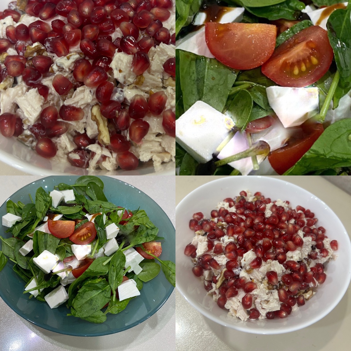 Итак, продолжаем серию рецептов салатов к новогоднему праздничному столу. Салат "Гранатовая сказка" Ингредиенты: - Куриное филе — 300 г - Гранат — 1-2 шт. - Орехи грецкие— 50 -80 г - Майонез или сметана — по вкусу (я добавляю майонез). - Соль, перец — по желанию. Пошаговое приготовление: 1. Отварите куриное филе, остудите и нарежьте мелкими кусочками. 2. Разделите гранат на зерна. 3. Обжарьте орехи на сухой сковороде и измельчите их. 4. В салатнике смешайте курицу, орехи и половину гранатовых зерен. 5. Заправьте майонезом или сметаной, посолите и поперчите. 6. Перед подачей украсьте салат оставшимися зернами граната. Салат "Свежесть" Ингредиенты: - Огурцы — 2 шт. - Помидоры — 3 шт. - Болгарский перец — 1 шт. - Листья салата, шпинат или руккола (зелень на ваш вкус) - 100г. - Фета или брынза — 100 г. - Оливковое масло — по вкусу. - Лимонный сок — по желанию. - Соль, перец — по вкусу. Пошаговое приготовление: 1. Огурцы, помидоры и перец нарежьте крупными кусочками. 2. Выложите лис