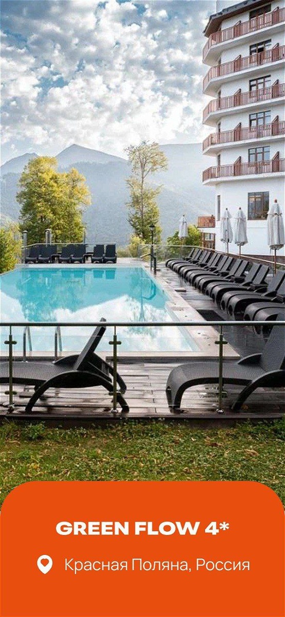 Красная Поляна: отдых на высоте c панорамным видом на горы 🎄 Выбор отеля в Красной Поляне — это важный шаг к идеальному отпуску. Чтобы вы не тратили время на сомнения, мы нашли для вас настоящую жемчужину — отель Green Flow 4*. У него уникальная атмосфера и характер, чтобы ваш отдых стал именно таким, как вы мечтаете 📍 GREEN FLOW 4* • Идеальное расположение: отель находится в самом сердце Красной Поляны, в шаговой доступности от канатных дорог горнолыжного курорта «Роза Хутор». И зимой, и летом вы в эпицентре событий. • Эко-философия: название отеля говорит само за себя. Green Flow — это гармония с окружающей средой. Натуральные материалы в отделке, энергосберегающие технологии и внимание к деталям создают особую, свежую атмосферу. • Всесезонность: здесь здорово в любое время года! Зимой — лыжи и сноуборд, весной и летом — хайкинг, велопрогулки, сплавы по горным рекам, а осенью — наслаждение живописными пейзажами. • Спа-комплекс с открытым бассейном: после активного дня на склонах