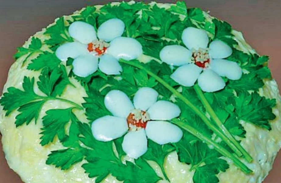 200 г отварной или копчёной курицы 3 яйца, 150 г маринованных грибов 100 г корейской моркови 150 г твёрдого сыра майонез, петрушка и укроп для украшения. Всё натереть на тёрке и выложить слоями: курица, морковь, яйца, грибы, сыр, каждый слой промазать майонезом, сверху украсить зеленью.