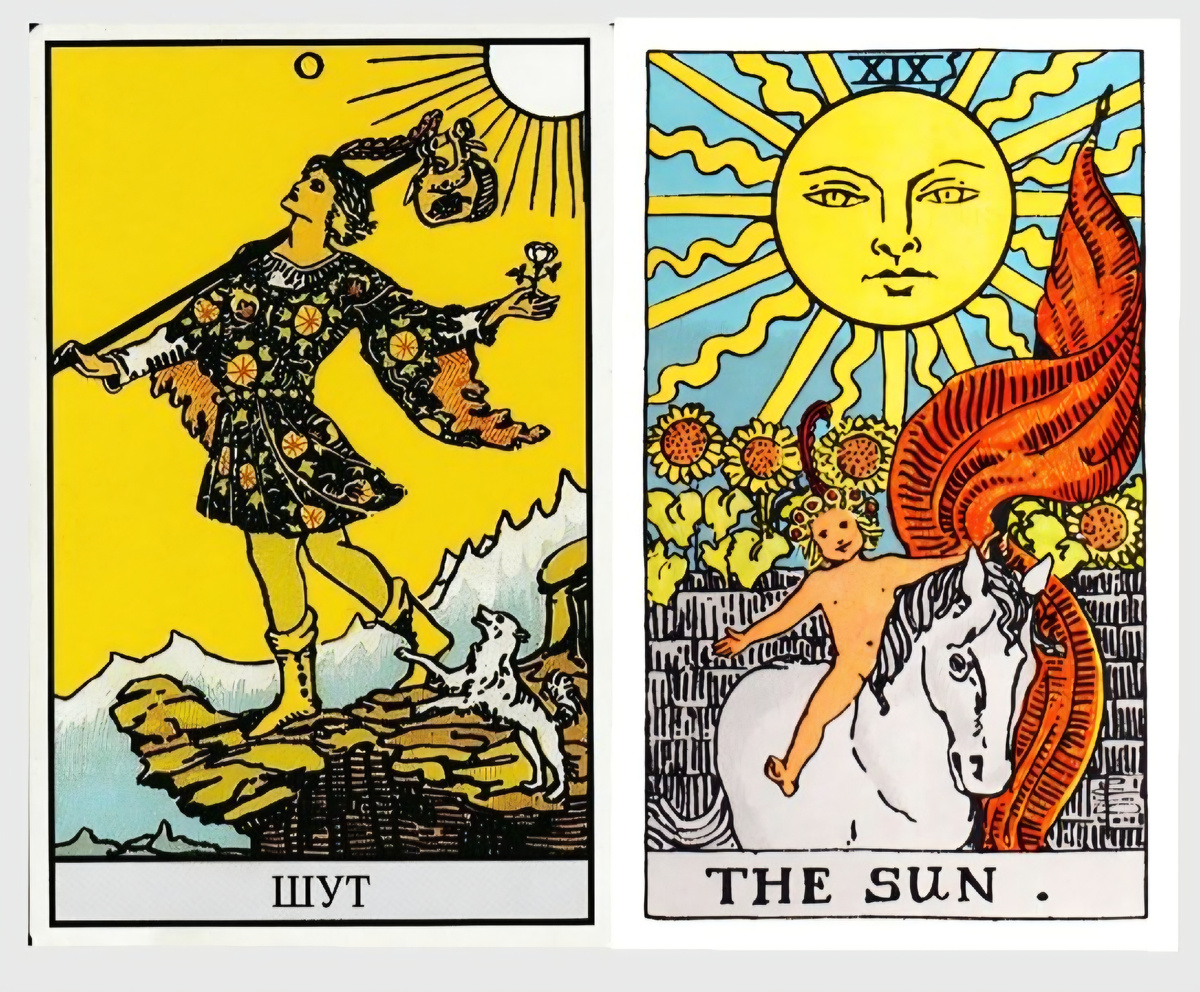 Невинный старт (Шут) немедленно озаряется ярким светом успеха, радости, ясности и жизненной силы (Солнце). Это прыжок в объятия счастливой судьбы. Начало, которое с самого первого шага приносит признание, счастье и ощущение "я на своем месте".