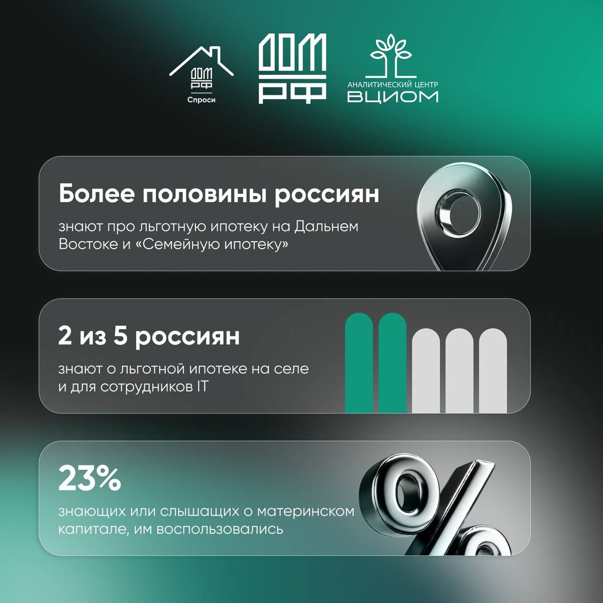 📈 Более 50% россиян знают о Дальневосточной и Семейной ипотеке, а каждый четвертый гражданин, знающий о материнском капитале, воспользовался им. Такие результаты показал опрос ДОМ.РФ и Аналитического центра ВЦИОМ. Он проводился среди 1,6 тысячи респондентов старше 18 лет из более 500 городов и 100 сел России. Как выросла осведомленность россиян о льготных ипотечных программах и какой процент граждан обращается за консультацией по вопросам покупки жилья и оформления ипотеки — читайте в карточках и на портале спроси.дом.рф. 💬 Подпишитесь на спроси.дом.рф в Telegram