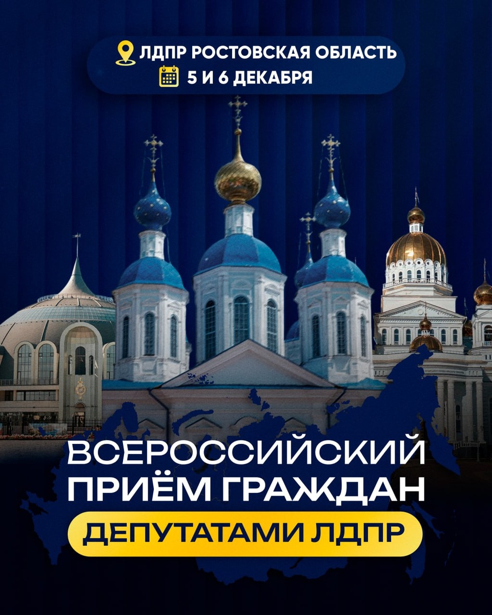ЛДПР проведёт приём граждан в Ростовской области ✨✨✨ 5 и 6 декабря жители Ростовской области смогут лично обратиться к депутатам и представителям ЛДПР в рамках очередного Всероссийского приёма граждан. ➡ Это возможность получить поддержку по самым разным вопросам — от социальной помощи и проблем ЖКХ до земельных, юридических и организационных ситуаций, с которыми люди сталкиваются в повседневной жизни. Все обращения будут внимательно изучены, а самые сложные — переданы в профильные структуры для оперативного решения. 📍 Адреса приёма в Ростове-на-Дону: 🔵 Общественная приёмная ЛДПР — ул. Филимоновская, 128 🔵 Приёмная ЛДПР — ул. Чудная, 10 ❗ Приёмы также пройдут во всех местных отделениях партии по Ростовской области 📝 Запись по телефону: 8-918-506-73-83 «Человек не должен оставаться один на один со своей проблемой. Мы готовы разбираться с каждым обращением и добиваться результата», — отметил координатор Ростовского регионального отделения ЛДПР Денис Фраш. 🔠🔠 Рядом с каждым!