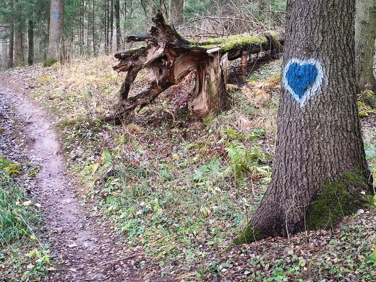 С удовольствием разглядывали картинки на стволах деревьев, сделанные, видимо, для того, чтобы не скучно было идти по лесу. Ведь этот участок - полностью лесной!