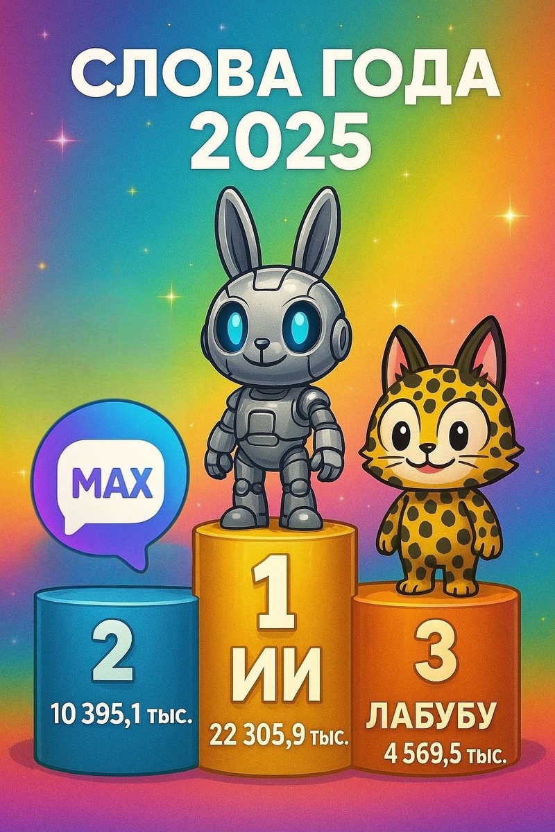 😋 «Слова года»: что говорила молодежь в 2025 году. Компания «Медиалогия» представила рейтинг самых популярных слов и выражений, которые определяли нашу речь в этом году. В топ вошли слова, отражающие ключевые тренды в технологиях, культуре и повседневном общении. 🏆 Тройка лидеров: 1). «ИИ» (искусственный интеллект) — безоговорочный лидер. Технологии меняют всё — от работы до творчества. 2). «MAX» — новый российский мессенджер, о котором не говорил только ленивый. Уже пробовали? 3). «Лабубу» — зубастый монстрик, который захватил соцсети и сердца пользователей. Остальной список слов можете увидеть в карточке, имба же? 😄