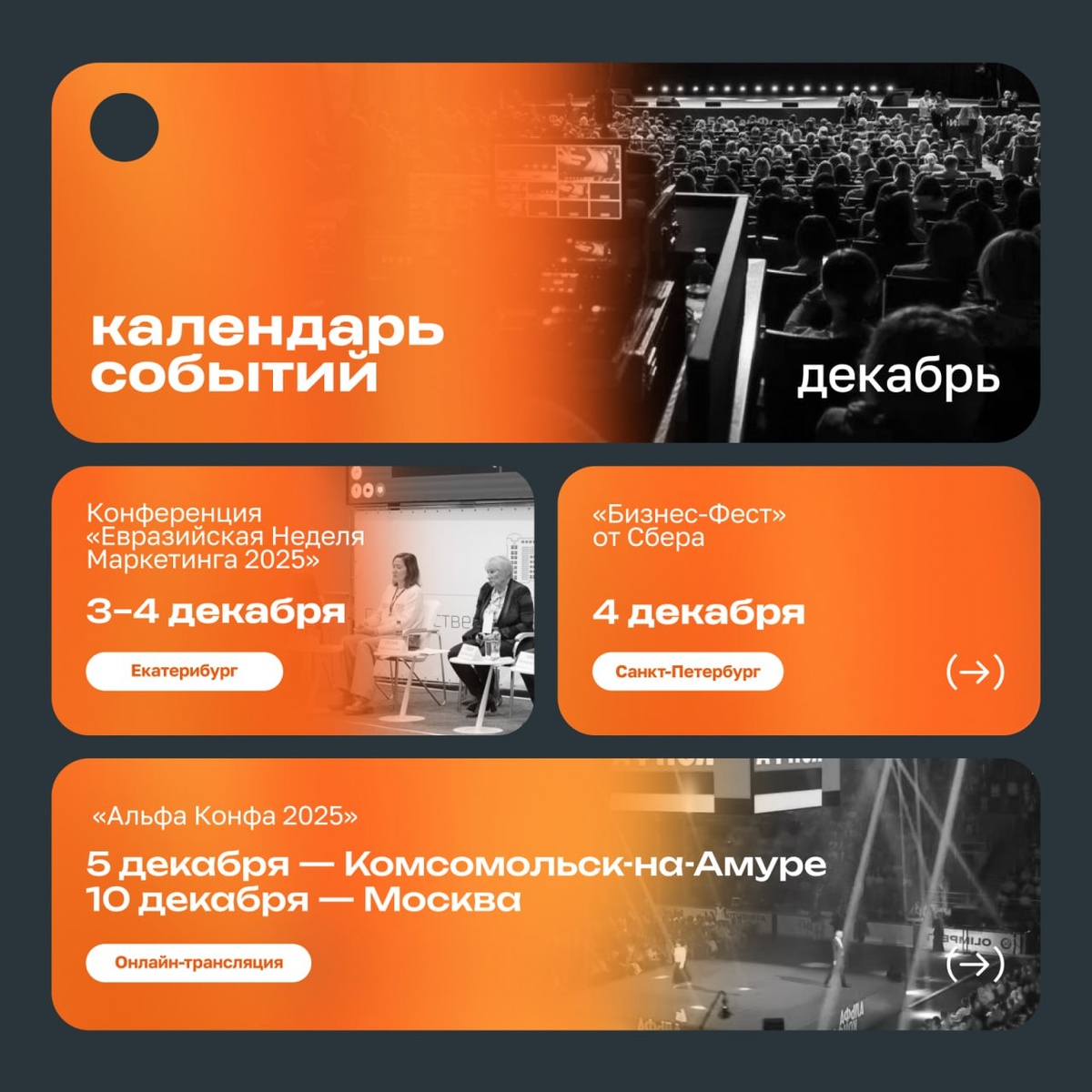 Бизнес-календарь на декабрь 2025 года 📅 Декабрь — время не только закрывать проекты, но и прокачивать себя и команду. Собрали подборку деловых мероприятий для предпринимателей и топ-менеджеров в разных регионах России ⭐️ Конференция «Евразийская Неделя Маркетинга 2025» 3–4 декабря 2025 года 🔻 Екатеринбург | Офлайн + онлайн Маркетинговая стратегия, позиционирование бренда, Digital и SMM, оценка эффективности каналов и запуск новых продуктов. Формат для собственников, маркетинг-директоров и тех, кто отвечает за рост выручки и работу с рынком ⭐️ «Бизнес-Фест» от Сбера 4 декабря 2025 года 🔻 Санкт-Петербург | Офлайн Большой фестиваль для предпринимателей и топ-менеджеров. На площадке — выступления спикеров, разборы реальных кейсов, менторские сессии и сильный нетворкинг. Хороший формат, чтобы за один день собрать идеи для развития и познакомиться с партнёрами или инвесторами ⭐️ «Альфа Конфа 2025» Даты и города в декабре 2025 года: 🔻 5 декабря — Комсомольск-на-Амуре | Офлайн 🔻 10 де