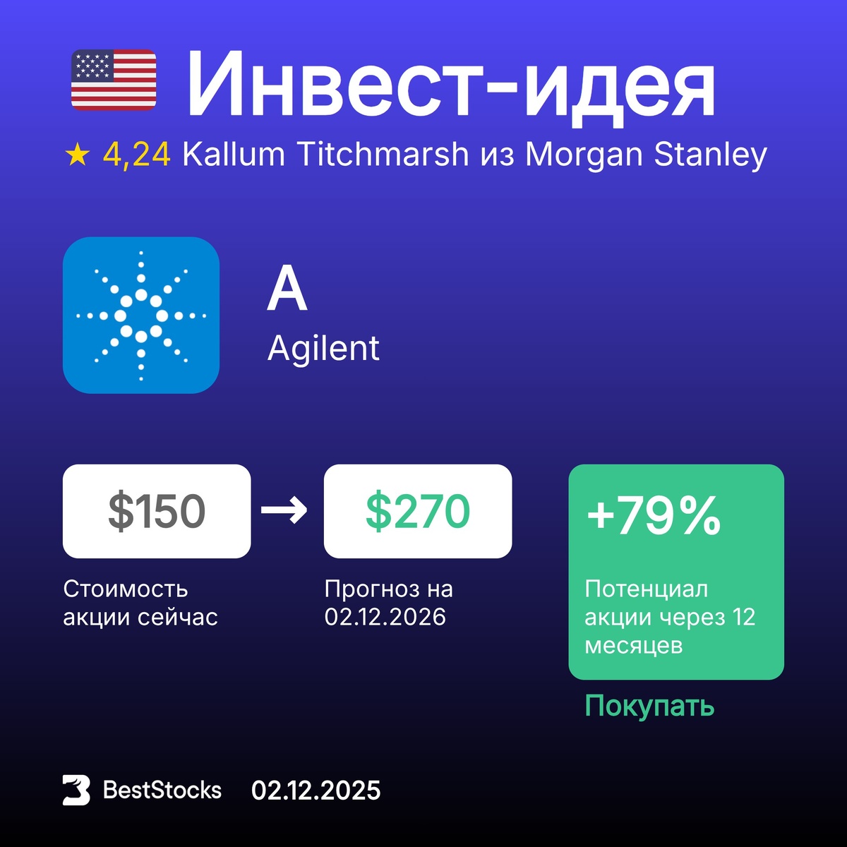 🇺🇸 Инвест-идея по акции Agilent Тикер: A Прогнозная цена: $270 (+79%) Рекомендация: Покупать InvestRank акции: 9 из 10 Прогноз сделан: 02.12.2025 Прогноз до: 02.12.2026 Инвест-компания: Morgan Stanley Аналитик: Kallum Titchmarsh Ещё рекомендации на сегодня → ••••• ❓ Брокер перестал показывать стоимость портфеля? Это можно исправить — BestStocks сделал специальный бесплатный инструмент, который показывает стоимость всех акций в вашем портфеле в реальном времени. Попробовать бесплатно