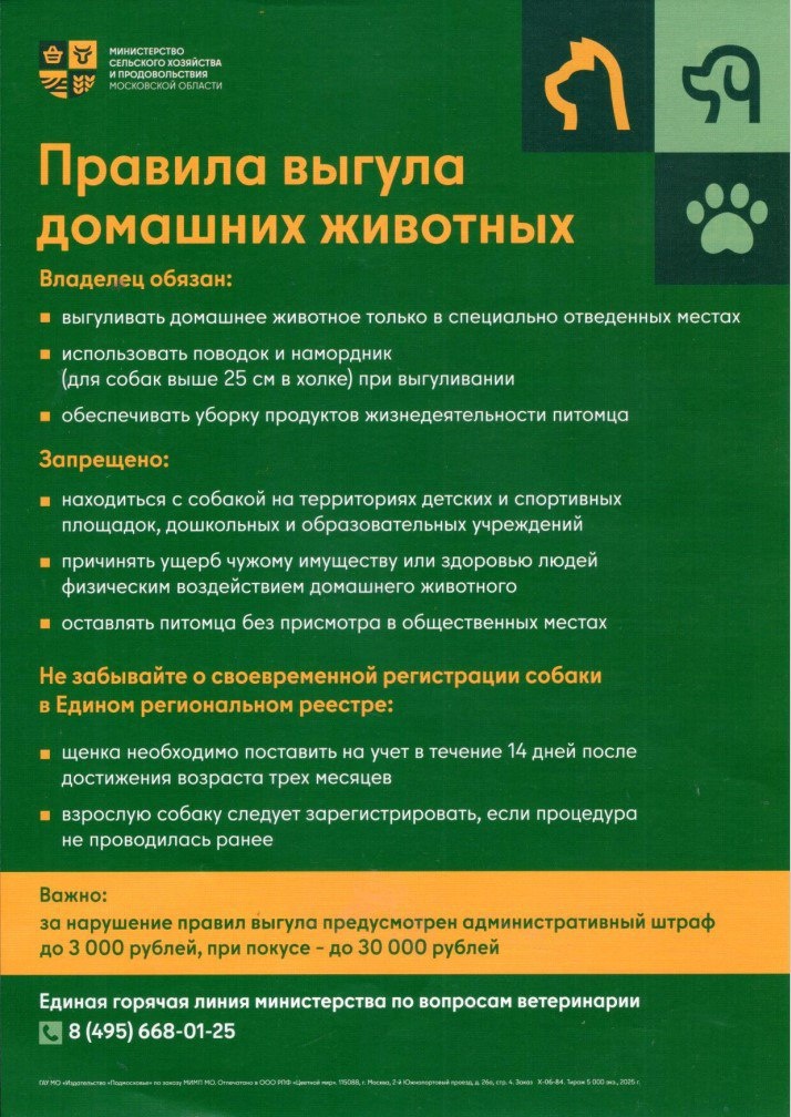 Уважаемые владельцы животных! Напоминаем вам о правилах выгула домашних питомцев! ❗️Владелец ОБЯЗАН: - выгуливать домашнее животное только в специально отведенных местах; - использовать поводок и намордник (для собак выше 25 см в холке) при выгуливании; - обеспечивать уборку продуктов жизнедеятельности питомца. ❗️❗️ЗАПРЕЩЕНО: - находиться с собакой на территории детских и спортивных площадок, дошкольных и образовательных учреждений; - причинять ущерб чужому имуществу или здоровью людей физическим воздействием домашнего животного; - оставлять питомца без присмотра в общественных местах. ВАЖНО: за нарушение правил выгула предусмотрен административный штраф до 3000 рублей, при покусе – до 30000 рублей. 📲Единая горячая линия министерства сельского хозяйства и продовольствия Московской области 8(495)668-01-25. Помните: забота о питомцах — это не только любовь, но и обязательные нормы. Будьте ответственными владельцами и соблюдайте правила! ✅ Присоединяйся к каналу в MAX #Лю