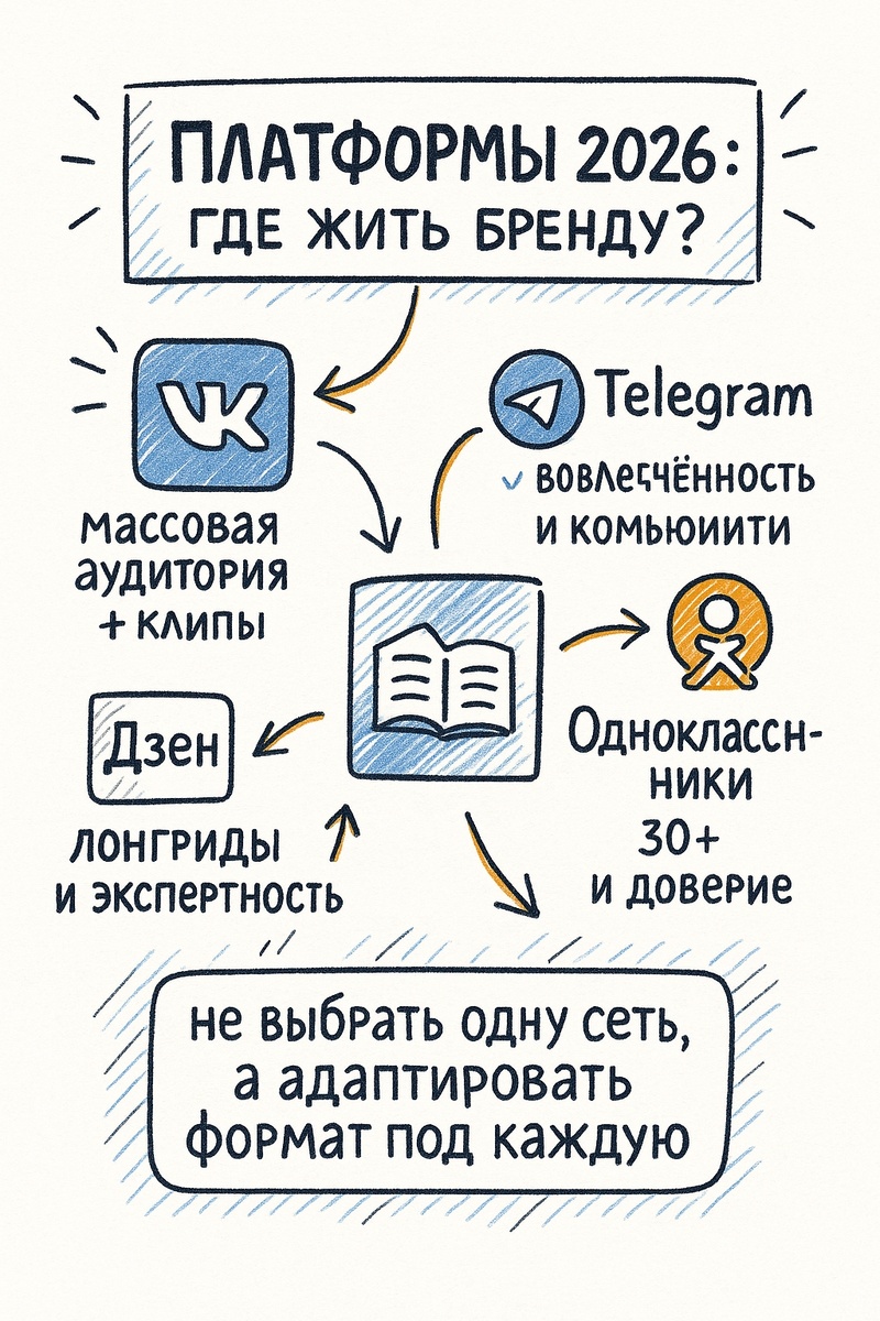 📊 Платформы 2026: где жить бренду? 🤔 Маркетинг постоянно меняется, и в 2026 году каждая площадка требует своего подхода. Куда же вкладывать силы, если хотите быть ближе к аудитории? 🔹 ВКонтакте – по-прежнему самая массовая социальная сеть в России. Но здесь растёт популярность клипов и видео. Классические методы прироста (розыгрыши, кросс-постинг, игры) работают, а клипы дают неожиданные охваты. Это идеальная площадка для брендов, которые умеют быстро создавать динамичный видеоконтент. ✈ Telegram – меньше по количеству пользователей, но опережает ВК по вовлечённости: 61 млн человек заходят сюда каждый день. Важно менять формат «я вещаю» на «мы общаемся» — каналы, чаты и чат-боты позволяют строить диалог и быстро прогревать аудиторию. 📚 Дзен и Одноклассники – часто недооценены. Дзен подходит для длинных материалов и экспертного контента – от вас ждут содержательных лонгридов и продуманных заголовков. Одноклассники – платформа для аудитории 30+ с традиционными ценностями, где цен
