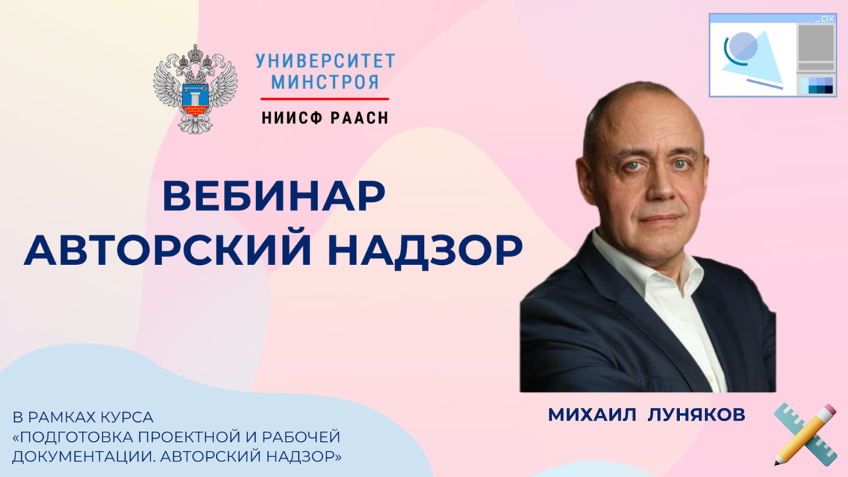 🔔 АВТОРСКИЙ НАДЗОР СТАНЕТ ТЕМOЙ ЗАВТРАШНЕГО ВЕБИНАРА УНИВЕРСИТЕТА МИНСТРОЯ ➡️ Университет Минстроя НИИСФ РААСН завтра проведет бесплатный вебинар «Авторский надзор». Он завершит серию занятий экспресс-курса «Подготовка проектной и рабочей документации. Авторский надзор», объединяющего темы, которые формируют современный подход к проектированию и сопровождению строительства 📹 Эфир состоится 3 декабря с 11:00 до 12:30 (мск). Присоединиться смогут все желающие: ссылка на трансляцию появится в официальной группе Университета Минстроя за 15 минут до начала 🎤 Вебинар проведёт Михаил Александрович Луняков — Завкафедрой Корпоративной кафедры Минстроя России НИУ МГСУ, доктор экономических наук, профессор, государственный советник РФ 2 класса, почётный строитель России и эксперт в сфере нормативного регулирования и надзорных процедур 💬 Завтрашнее занятие будет посвящено современным требованиям к авторскому надзору в 2025 году. Участники узнают, как выстраивается работа специалиста на стр