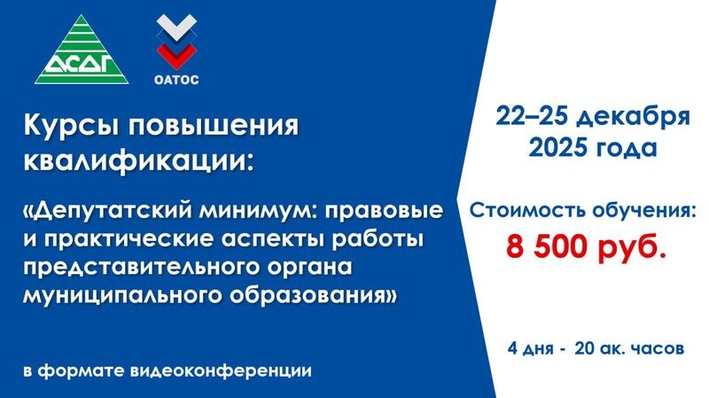 🟩🟩🟩🟩🟩 22 - 25 декабря – пройдет курс повышения квалификации по образовательной программе «Депутатский минимум: правовые и практические аспекты работы представительного органа муниципального образования» 🅰️🅰️🅰️🅰️🅰️🅰️❗️ ⚡️ Ассоциация сибирских и дальневосточных городов (АСДГ) приглашает Вас на курсы повышения квалификации, разработанные для депутатов представительных органов муниципальных образований, помощников депутатов, муниципальных служащих, руководителей и специалистов исполнительных органов власти, осуществляющих взаимодействие с представительными органами местного самоуправления. Программа обучения включает следующие темы: 1. Основы местного самоуправления. 2. Статус депутата представительного органа местного самоуправления. 3. Муниципальные акты. 4. Основы парламентской этики. 5. Экономика и финансы муниципального образования. 6. Работа с избирателями. 7. Работа с гражданами на избирательном округе. 8. Депутат как объект журналистского исследования. ⚡️ Продолжи