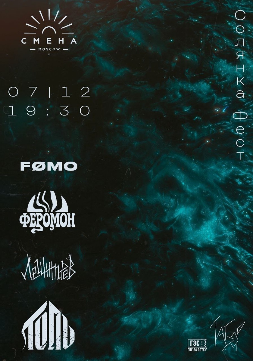 Москва ● Смена 2.0 ● 07.12 (Вс) ● 19:30 #metal #punk #stoner #triphop ► Солянка Фест ● TG ● VK Солянка – место где разное сливается воедино! 4 команды клуб Смена И музыка на любимый вкус! от Трип-Хопа и Гранжа, до Ню-Метала и Стоунера! Участники: ► FØMO ● TG ● VK ► Феромон ● TG ● VK ► Лешимрев ● TG ● VK ► Топь ● TG ● VK Билеты от 300₽