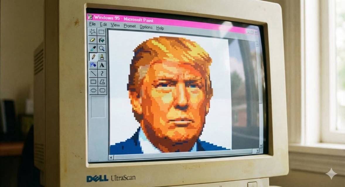 Рисуем портреты в Paint на Windows 95 — понадобится один промт для Nano Banana Pro. Large close-up photo of a vintage beige CRT monitor, authentic Dell UltraScan logo centered on the bottom bezel. The monitor dominates the frame with minimal surroundings. The screen is illuminated, showing the classic Windows 95 Microsoft Paint interface with a neon-pink active title bar, standard tool icons on the left, and a clean white canvas. Inside the canvas is a highly pixelated pixel-art portrait of [ИМЯ] with large, clearly visible pixels, and the portrait spans the full width of the Paint canvas from edge to edge. No additional UI elements, no extra text beyond default Paint labels. The CRT display shows a crisp pixel grid, horizontal scanlines, subtle RGB subpixel texture, and a curved glass surface with soft reflections from a sunny window and faint room shapes without any distracting objects. The background is minimal and softly blurred. The monitor’s beige plastic has light 90s-style a