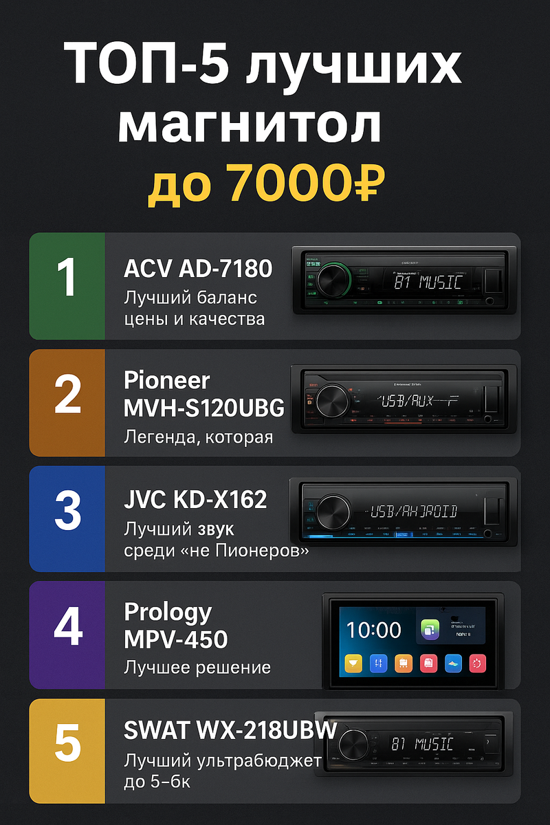 Если у тебя бюджет не бесконечный, но хочется нормальный звук, удобное управление и никаких «подвисаний» — до 7 тысяч есть отличные варианты. Главное — знать, что покупать. Собрал для тебя честный топ без рекламы и китайских сказок. 🟩 1 место — ACV AD-7180 » Лучший баланс цены и качества 💸 Цена: 6 500–7 000 ₽ 📦 Где купить: Ozon, WB, 220В Почему топ: отличный звук за эти деньги, нормальный DSP, быстрый интерфейс, Bluetooth не фонит и не рвёт звук, яркий экран, который видно днём. Минусы: камера заднего вида нужна хорошая, дешёвую не тянет. Если хочешь стабильность и нормальное звучание без мозга — это вариант №1. 🟧 2 место — Pioneer MVH-S120UBG » Легенда, которая до сих пор тащит 💸 Цена: 5 500–6 800 ₽ 📦 Где купить: Автодевайс, Ozon Плюсы: реально честный звук (Pioneer всё-таки), поддержка FLAC, всё просто и логично в управлении, живёт годами. Минусы: нет Bluetooth, но зато звук топовый. Если блютуз нужен — подключай отдельный адаптер за 700 ₽. 🟦 3 место — JVC KD-X1