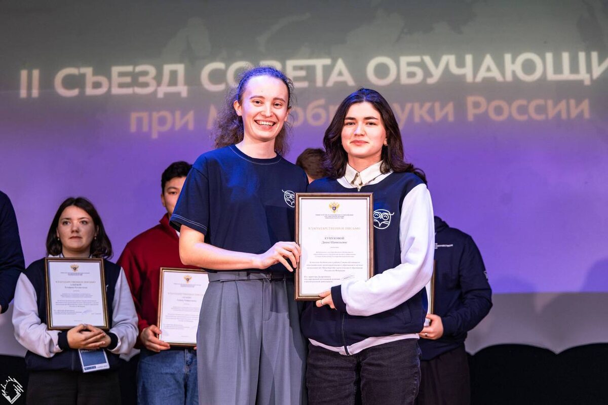 🤩 Председатель Совета обучающихся СКГА удостоена Благодарственного письма Минобрнауки России Председатель Совета обучающихся Северо-Кавказской государственной академии награждена Благодарственным письмом Министерства науки и высшего образования Российской Федерации. Награда присуждена за особый вклад в развитие студенческого самоуправления и работу Совета обучающихся при Минобрнауки России. Из 117 представителей образовательных организаций страны, входящих в состав Совета, были отмечены лишь 13 председателей. Наша студентка стала единственным представителем от всего Северо-Кавказского федерального округа, получившим эту награду. Председатель Совета обучающихся СКГА вошла в состав федерального Совета в декабре 2024 года, а уже в январе 2025 года возглавила его медиа-направление. Награждение состоялось в ходе 2-го Съезда Совета обучающихся при Минобрнауки России, который прошел с 27 по 30 ноября на площадке учебного центра «Бауманец». В рамках съезда были подведены итоги работы за г