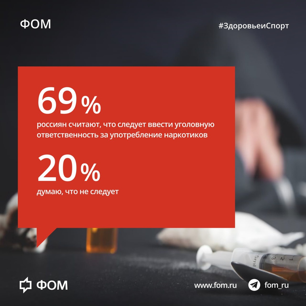 👩⚕️ Распространённость наркозависимости: Распространённость наркомании и причины её роста в российском обществе Большинство опрошенных (56%) думают, что наркоманы сами виноваты в своей зависимости. 24% полагают, что к этому их подтолкнули обстоятельства, 20% затруднились с ответом. 69% участников опроса считают, что людей, употребляющих наркотики, следует принудительно лечить, 18% с этим не согласны. 69% опрошенных поддерживают введение уголовной ответственности за употребление наркотиков, 20% выступают против. Подробнее: fom.ru #АлкоголизмиНаркомания #законы #толерантность #УровеньЖизни 📱 Фонд Общественное Мнение