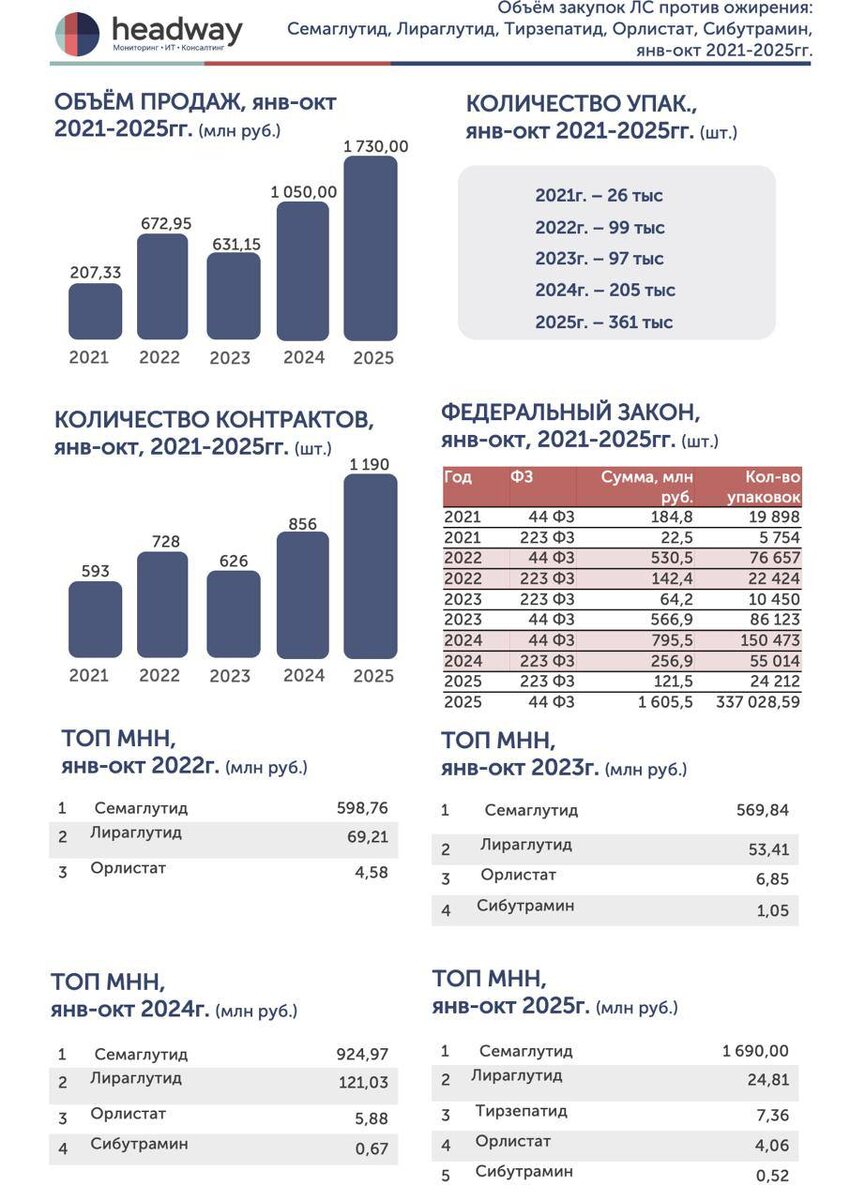 Семаглутид, Лираглутид, Тирзепатид, Орлистат, Сибутрамин СРАВНЕНИЕ 2024г и 2025г (январь-октябрь) Январь-октябрь 2024г. Объём продаж составляет 1,05 млрд руб. (+66,3%). Львиную долю закупок в 2024г. занимает 🥇 Семаглутид (87,88%) - 924,97 млн руб. На втором месте 🥈Лираглутид (11,50%) - 121,03 млн руб. На третьем - 🥉Орлистат (0,56%) - 5,88 млн руб. Из них: 🔴67,63% занимают льготные закупки -711,89 млн руб. 🔴21,94% ритейл - 230,97 млн руб. 🔴9,06% госпитальные закупки - 95,33 млн руб. Кол-во контрактов - 856 Пик закупок пришелся на: Март - 231,25 млн руб. Август - 199,33 млн руб. 💊Распределение по Брендам, топ-5, млн руб.: 1. Квинсента - 500,41 (105,51 тыс упак.) 2. Семавик - 359,65 (74,65 тыс упак.) 3. Энлигрия - 103,63 (6,04 тыс упак.) 4. Инсудайв - 52,19 (10,92 тыс упак.) 5. Весфол - 7,52 (519 упак.) 🚚Топ-5 поставщиков, млн руб. 🔴ООО Торговый дом БФ -301,11 (доля 28,61%) 🔴ООО БСС - 268,26 (доля 25,49%) 🔴ООО Ирвин 2 - 166,95 (доля 15,86%) 🔴ООО Интелтрейд - 84,75 (доля 8,