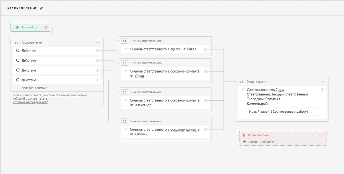 Плюсы автоматического распределения сделок Скорость обработки лидов — заявки сразу попадают к нужному менеджеру, без ручного распределения. Справедливая нагрузка — лиды делятся по заданным правилам, исключая перекосы в загрузке. Снижение ошибок — автоматика исключает человеческий фактор (пропущенные заявки, «забытые» клиенты). Персонализация работы — менеджеры получают клиентов по своей специализации (VIP, холодные лиды, региональные заявки). Контроль и аналитика — легко отслеживать, кто и как работает с разными типами сделок. Способ 1: Через триггеры - Конкретный менеджер