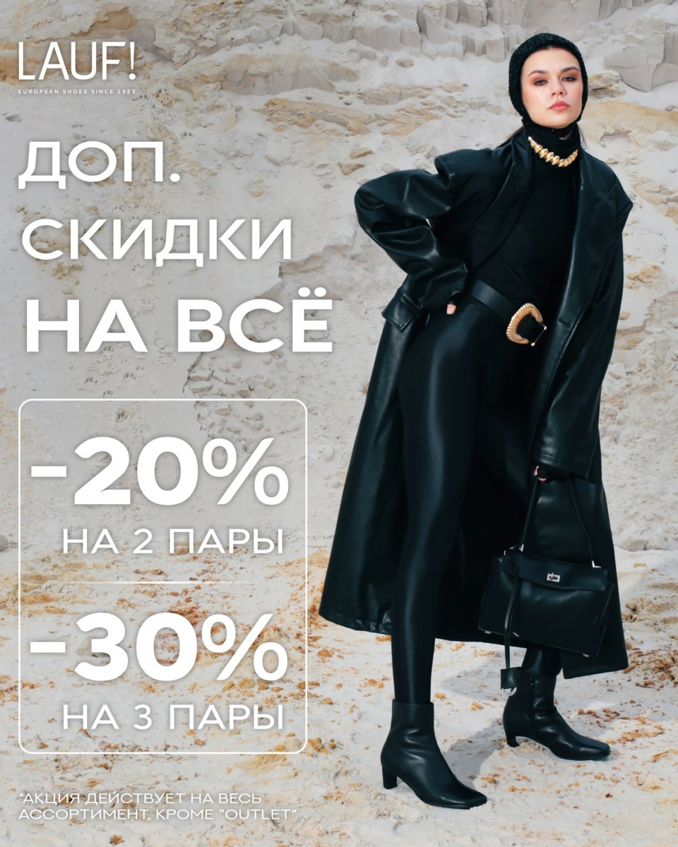 Откройте для себя шоппинг с LAUF! С каждой новой парой обуви и сумкой ваша выгода растёт: 2 товара — экономия 20% 3 и более товаров — 30% скидки Специальная акция LAUF! действует во всех магазинах и на сайте. Участвуют все товары, за исключением обуви и сумок из раздела "OUTLET". Если при получении вы решите взять меньше пар, чем заказали, скидка будет пересчитана в соответствии с фактическим количеством. Насладитесь покупками, которые дарят вдохновение на lauf.shoes.