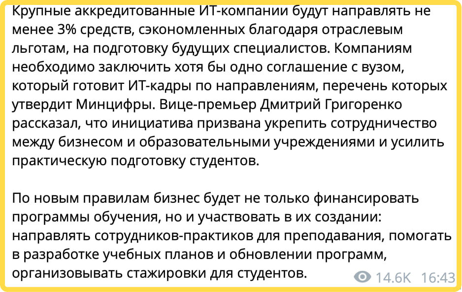 Хорошо, что мы мелкие и ИТ- аккредитованные компании :) У нас три юр.лица и везде аккредитация, хотя занимаемся кардинально разными вещами. Вот, читаю такую инициативу... Не ясно, 3% от оборота или чего, но все равно - это доп. нагрузка. Но крупняк не заметит, полагаю. А вообще полезная тема, правда рынок ИТ сейчас слегка лихорадит. Русский ИТ бизнес