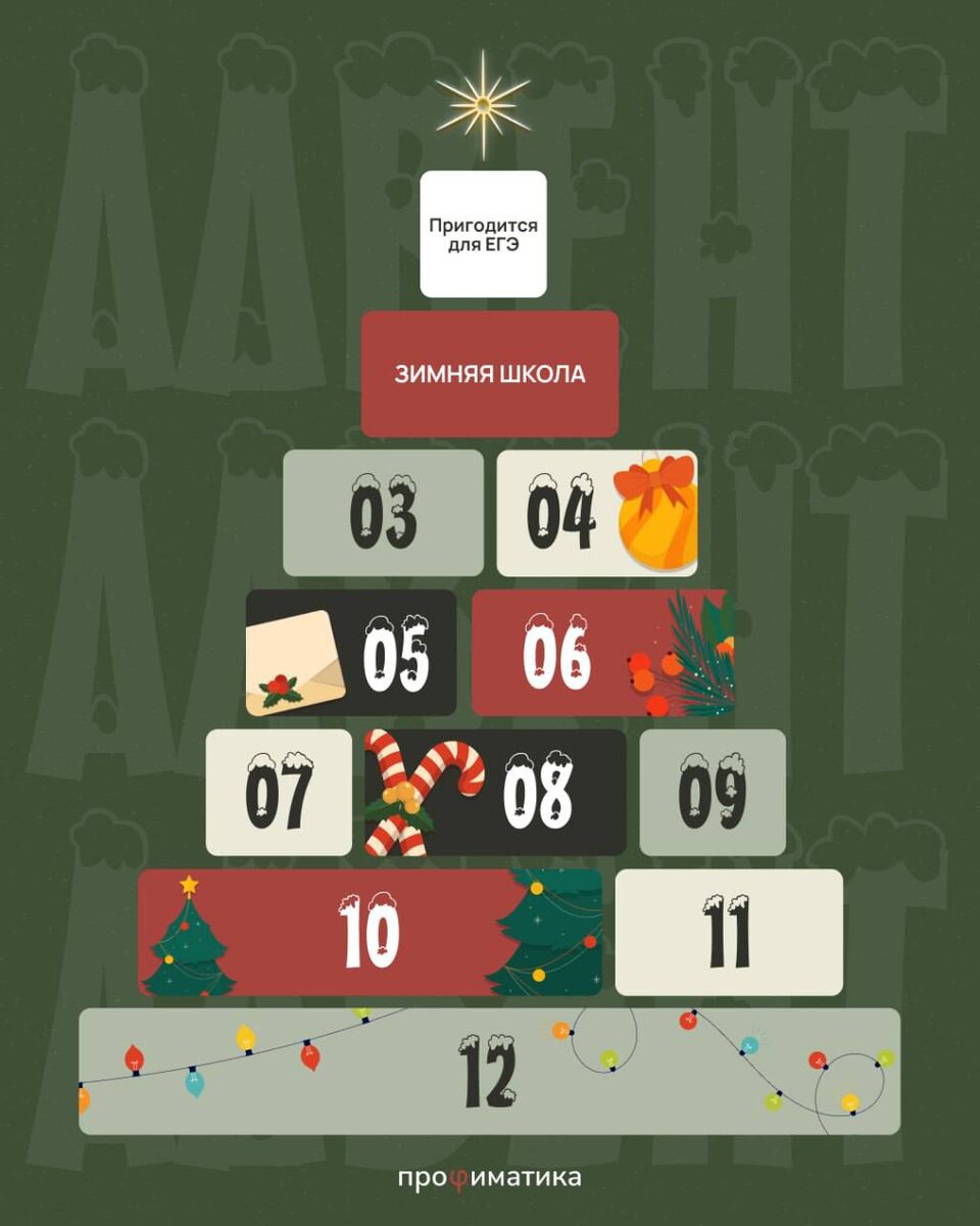 🎁ВТОРОЙ ДЕНЬ АДВЕНТА🎄 //сегодня мы вас точно удивим.. Мы открываем доступ к четырем занятиям Зимней школы — тем самым, которые доступны только ученикам полугодового курса!❤️ В рамках Адвента — мы даём вам возможность заглянуть внутрь курса бесплатно: — попробовать формат — лично познакомиться с преподавателями — понять, каким может быть обучение, когда оно структурное и реально работает — и, конечно, получить пользу уже сейчас Это не демо-версия и не «обзор». Это настоящие вебы из программы 📅 Расписание открытых занятий: 4 декабря, 17:00 — Открытый стрим Физика + Математика (СТАРТ Зимней школы) 6 декабря, 14:00 — Открытый веб по Обществознанию 6 декабря, 16:00 — Открытый веб по Русскому языку: «Как подготовиться к ЕГЭ по русскому за полгода» 7 декабря, 14:00 — Открытый веб по Информатике Чтобы получить доступ ко всем занятиям, вам нужно зарегестрироваться по ссылкам выше! ☝ Познакомьтесь с Зимней школой — и почувствуйте, как должна выглядеть настоящая подготовка без стресса и