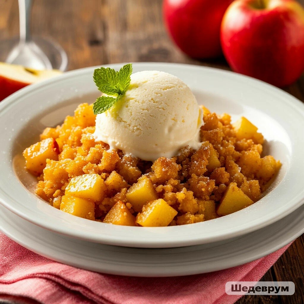 ДЕСЕРТ — ЯБЛОЧНЫЙ КРАМБЛ С ВАНИЛЬНЫМ МОРОЖЕНЫМ Мяу, мои пушистые сладкоежки! 😺🍎 А вот и коронный номер нашего английского ужина — яблочный крамбл! Это не просто пирог, это тёплые, тающие во рту яблочки под хрустящей, маслянистой крошкой. А когда его подают с шариком холодного ванильного мороженого... это просто небо на тарелке! Объедение, достойное королевы! 👑✨ ЯБЛОЧНЫЙ КРАМБЛ С ВАНИЛЬНЫМ МОРОЖЕНЫМ ИНГРЕДИЕНТЫ (для яблочной начинки): 🧾 ·Яблоки (лучше кисло-сладкие): 1 кг ·Сок лимона: 1 ст. ложка ·Сахар: 3 ст. ложки ·Молотая корица: 1 ч. ложка ·Мука пшеничная: 1 ст. ложка ИНГРЕДИЕНТЫ (для масляной крошки): 🧾 ·Мука пшеничная: 150 г ·Сахар: 100 г ·Масло сливочное: 100 г (очень холодное, нарезанное кубиками) ·Ванильное мороженое: для подачи ВРЕМЯ ПРИГОТОВЛЕНИЯ: ⏰ 1 час СЛОЖНОСТЬ:🐾 Справится любой котик ПОШАГОВЫЙ РЕЦЕПТ: 👩🍳 1. Разогреть духовку до 180°C. 2. Готовим начинку: Яблоки очистить от кожуры и сердцевины, нарезать тонкими дольками или небольшими кубиками. 3. Сложить