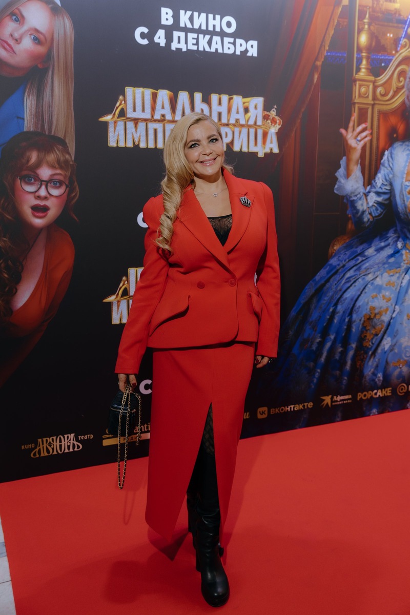 Ирина Пегова посетила премьеру фильма «Шальная императрица», в котором она сыграла главную роль. Мероприятие прошло 1 декабря в Санкт-Петербурге в кинотеатре «Аврора». На мероприятии 47-летняя актриса появилась в красном костюме, состоящем из юбки длины миди с разрезом и приталенного пиджака с накладными карманами и брошью в виде короны. Также актриса надела полупрозрачный топ и ботинки на высоких каблуках. Звезда завила волосы в кудри и уложила их с боковым пробором. Также она сделала вечерний макияж. Пегова дополнила свой образ маленькой черной сумочкой, подвеской с кулоном в виде сердечка и серьгами-гвоздиками. «Такие сценарии редко попадаются. Фильм классный, история классная», — рассказала актриса Кино Mail, почему согласилась сняться в проекте. В комедии режиссера Радды Новиковой она сыграла Екатерину II, которая из-за магического обряда трех подруг перемещается в современный мир и учится жить в новых реалиях. Пегова не в первый раз перевоплощается в императрицу Екатерину Великую