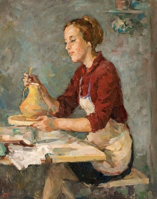 Александр Николаевич Богданов (1908, Киев - 1989, Москва), советский живописец, график, член Московского Союза Художников (1933), заслуженный мастер спорта СССР по фехтованию, ветеран Великой Отечественной войны. "Керамистка", 1968 Картон / масло, 49 x 39