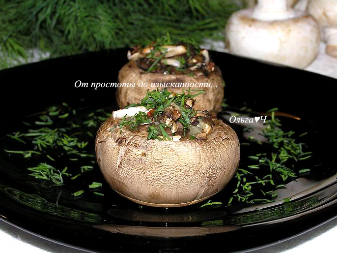 укроп для подачи Приготовление: Шляпки шампиньонов отделите от ножек. Лук и ножки шампиньонов мелко нарежьте, присолите. Нафаршируйте шампиньоны приготовленным "фаршем", выложите на противень. Запекайте при 200*С на верхнем уровне духовки около 15 минут (или пока лук не начнет румяниться, а из грибов выделяться жидкость). Снизьте температуру до 150*С и запекайте грибы на нижнем уровне духовки еще около 15 минут или до готовности. За 1 минуту до готовности посыпьте грибы рубленным укропом. Приятного аппетита! Вам также могут понравиться: