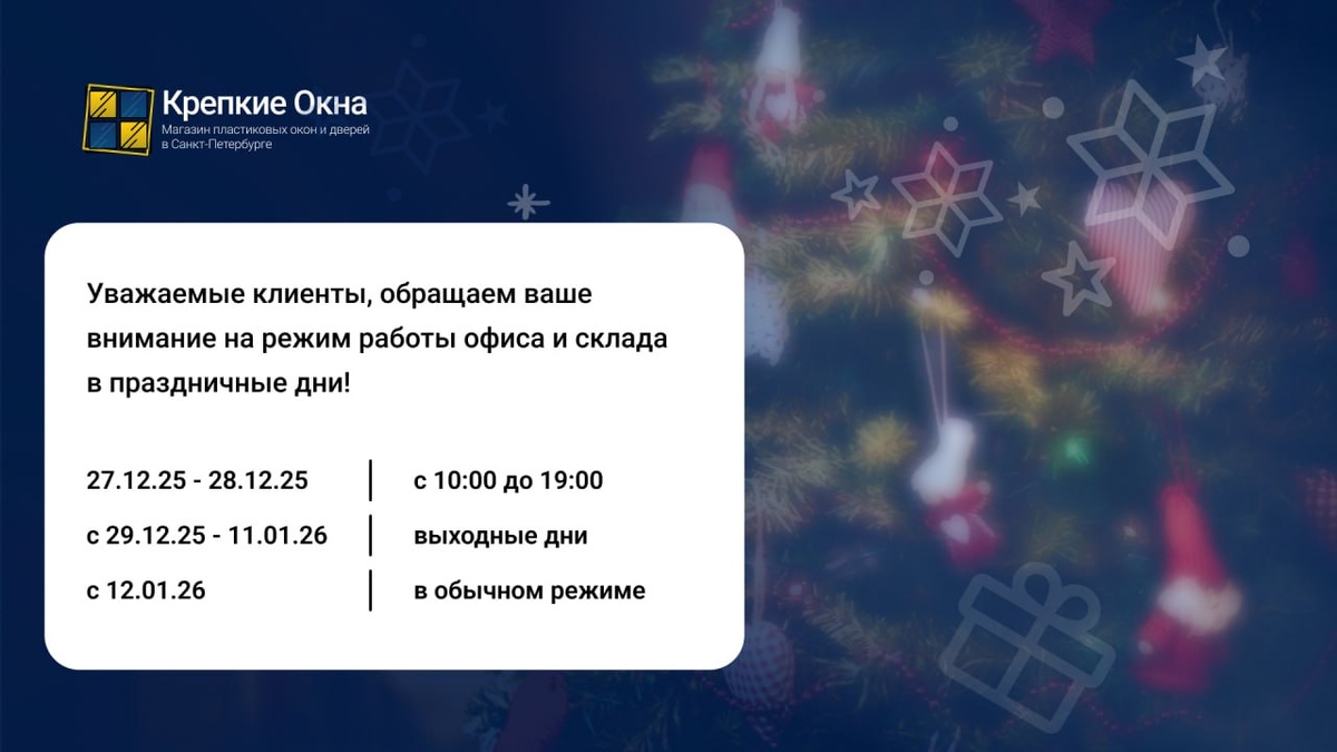 Уважаемые клиенты! Информируем вас о графике работы нашего офиса и склада в предпраздничные и праздничные дни. 27.12.2025 и 28.12.2025 - рабочие дни с 10:00 до 19:00. С 29.12.2025 по 11.01.2026 - выходные дни. В этот период офис и склад не работают. С 12.01.2026 - возвращаемся к обычному режиму работы. Просим учесть эти изменения при планировании ваших заказов и визитов.