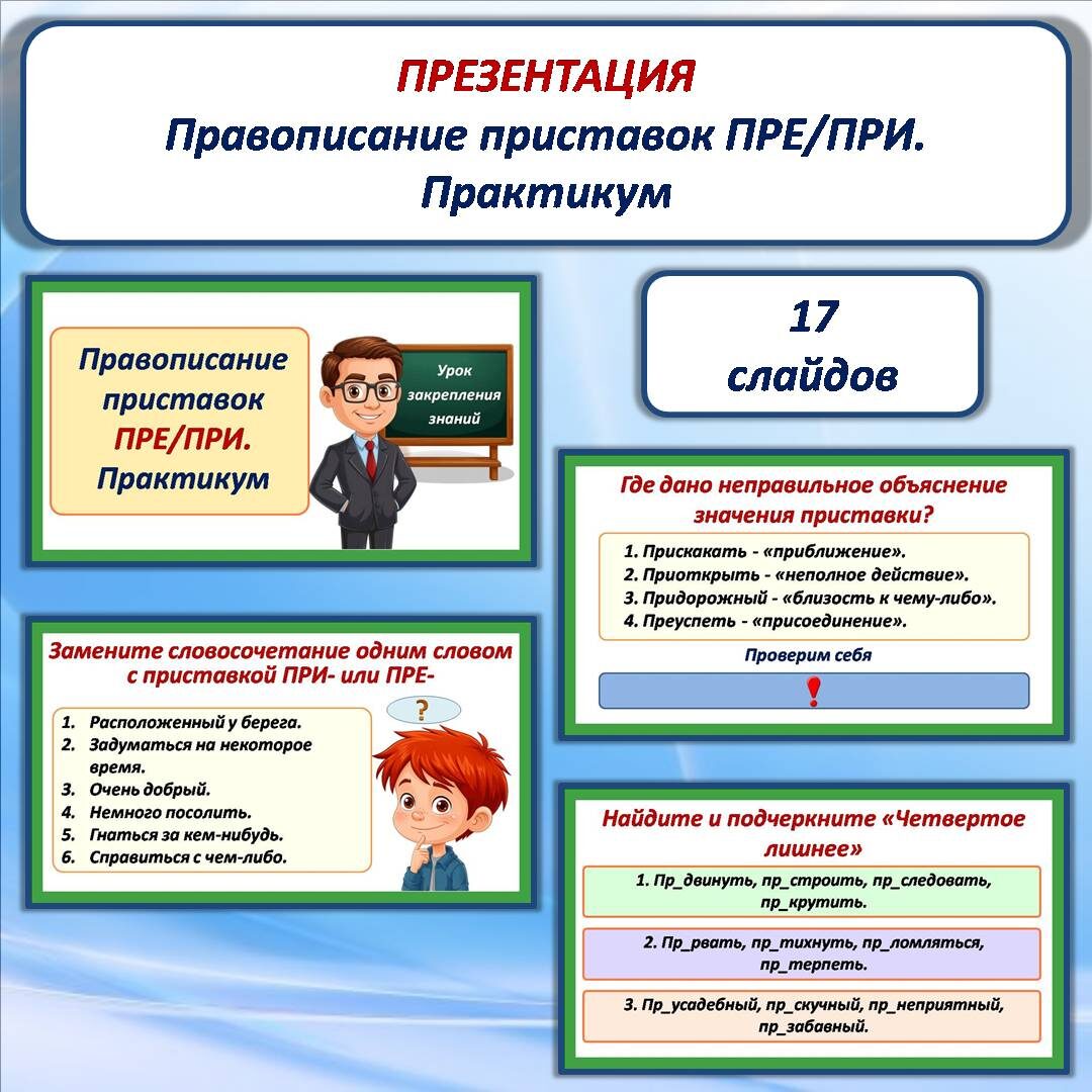 Презентацию скачать здесь Презентация состоит из 17 слайдов. Презентация анимирована. Учащиеся получат возможность осуществить самопроверку выполненных заданий. Слайд № 1. Титульный слайд. Слайд № 2. Правило написания слов с приставками ПРЕ/ПРИ. Слайд № 3. Распределите слова с приставкой ПРИ по группам. Слайд № 4. Распределите слова с приставкой ПРЕ по группам. Слайды № 5-7. Где дано неправильное объяснение значения приставки? Слайд № 8. В какой строке все слова пишутся с И? Слайд № 9. В какой строке все слова пишутся с Е? Слайд № 10. Замените словосочетание одним словом с приставкой ПРИ или ПРЕ. Слайд № 11. Проверьте себя. Слайд № 12. Найдите «Четвертое лишнее». Слайд № 13. Проверьте себя. Слайд № 14. Впишите пропущенные слова. Слайд № 15. Проверьте себя. Слайд № 16. Словарь трудных слов (правописание приставки определяется контекстом). Слайд № 17. Обратите внимание! Данная презентация станет ценным помощником для учителя русского языка. Она заинтересует учащихся, облегчит усвоение т