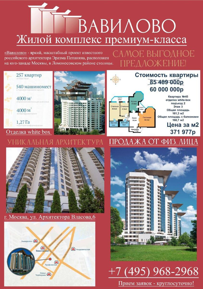 Вавилово - элитный жилой комплекс премиум-класса в Москве. ул. Архитектора Власова, дом 6 +7 (495) 968-2-968 arenda@vavilovo.com https://vavilovo.com Следите за нашими новостями в социальных сетях: https://vk.com/vavilovo https://www.instagram.com/vavilovo_com/ https://www.youtube.com/vavilovo https://www.facebook.com/vavilovocom https://rutube.ru/channel/24349084/ https://ok.ru/group/62395956068473
