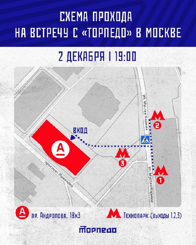 В ответ на пост Уважаемые болельщики! ❤️ Чтобы ваш визит на встречу с «Торпедо» был максимально комфортным, публикуем схему прохода к месту мероприятия. 📍 Адрес встречи: проспект Андропова, д. 18, к. 3 🚇 Ближайшая станция метро — «Технопарк» До встречи! 👏