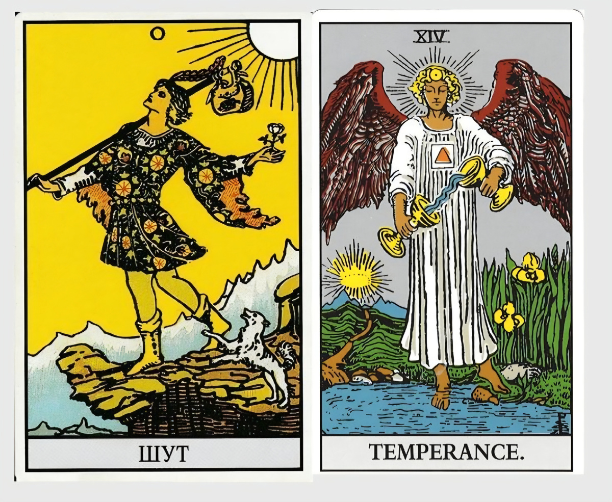Шут делает шаг, а Умеренность протягивает ему две чаши, говоря: "Твой путь — не в крайностях, а в их слиянии. Доверься потоку. Смешай свою невинность с мудростью, импульс — с терпением. Иди не спеша, адаптируйся, исцеляй и гармонизируй все, к чему прикасаешься. Ты — целительный мост между мирами".