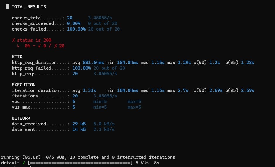 Всем привет! 👋 В предыдущем посте мы с вами запустили простенький сценарий по нагрузочному тестированию. У всех всё получилось? Пишите ваши результаты в комментариях! 🔍 Разбираем отчёт k6: что это вообще значит? Ок, вы запустили базовый сценарий, получили красивый отчёт… и зависли. Я, например, в свое время точно завис. Что означают все эти avg, p(95), iterations, vus? Давайте разберёмся - без лишней теории, только практический смысл. Отчет стартует со слов TOTAL RESULTS ✅ Checks - это как такие мини аналог ассертов, которые есть в Postman, и фреймворках автоматизации. В нашем скрипте одна проверка - на status code 200. checks_total: сколько всего проверок было за весь прогон. checks_succeeded: сколько из них прошли успешно, то есть вернулся на наш запрос status code=200. checks_failed: соответственно, сколько наших проверок провалилось. ✓ Подобные проверки дают нам понять насколько стабильно наша система работает под нагрузкой. Если с увеличением нагрузки checks_failed начин